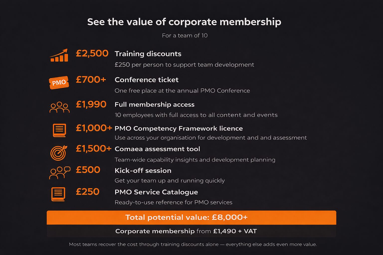 Each corporate member gets one free PMO Conference ticket each year (worth up to £590) plus £250 training course discount for any PMO Learning training courses.