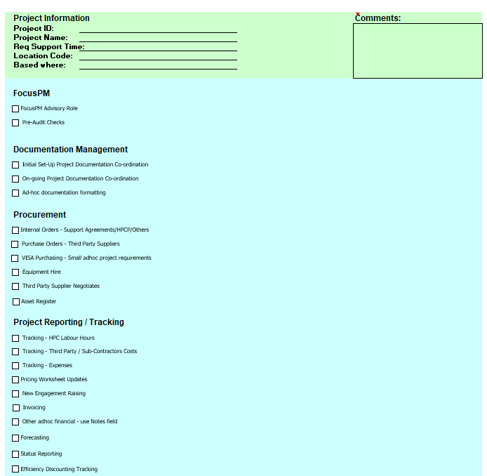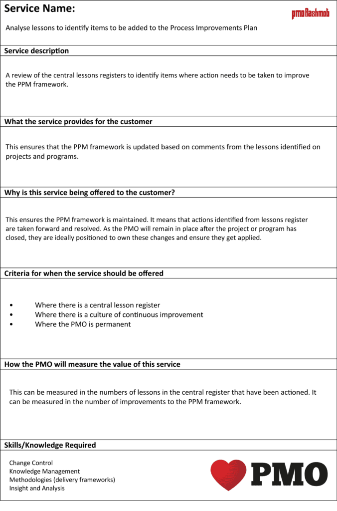 I don’t think there is a huge amount of explanation needed – which is exactly right – keep it simple! What we liked about this is that it’s a great exercise to work through with the PMO team members and then a sanity check with the customers who will be using the service.