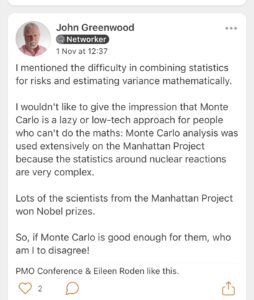 This session opened PMOLearn! in Edinburgh in November 2023 – the subtitle was Quantitative Methods to Inform Proposals and Delivery and was taught by John Greenwood, a leading expert in risk management.