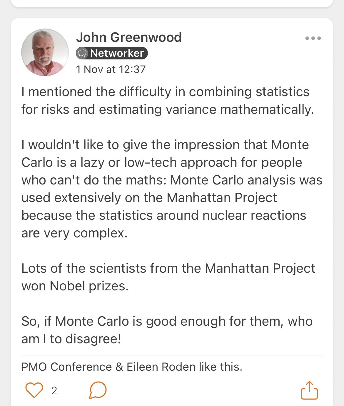 John also touched on issues related to equipment procurement, internal authorisation, delivery lead times, quality inspection, and the importance of lessons learned in project management. He also gave a brief overview of Monte Carlo techniques for risk analysis in project scheduling.
